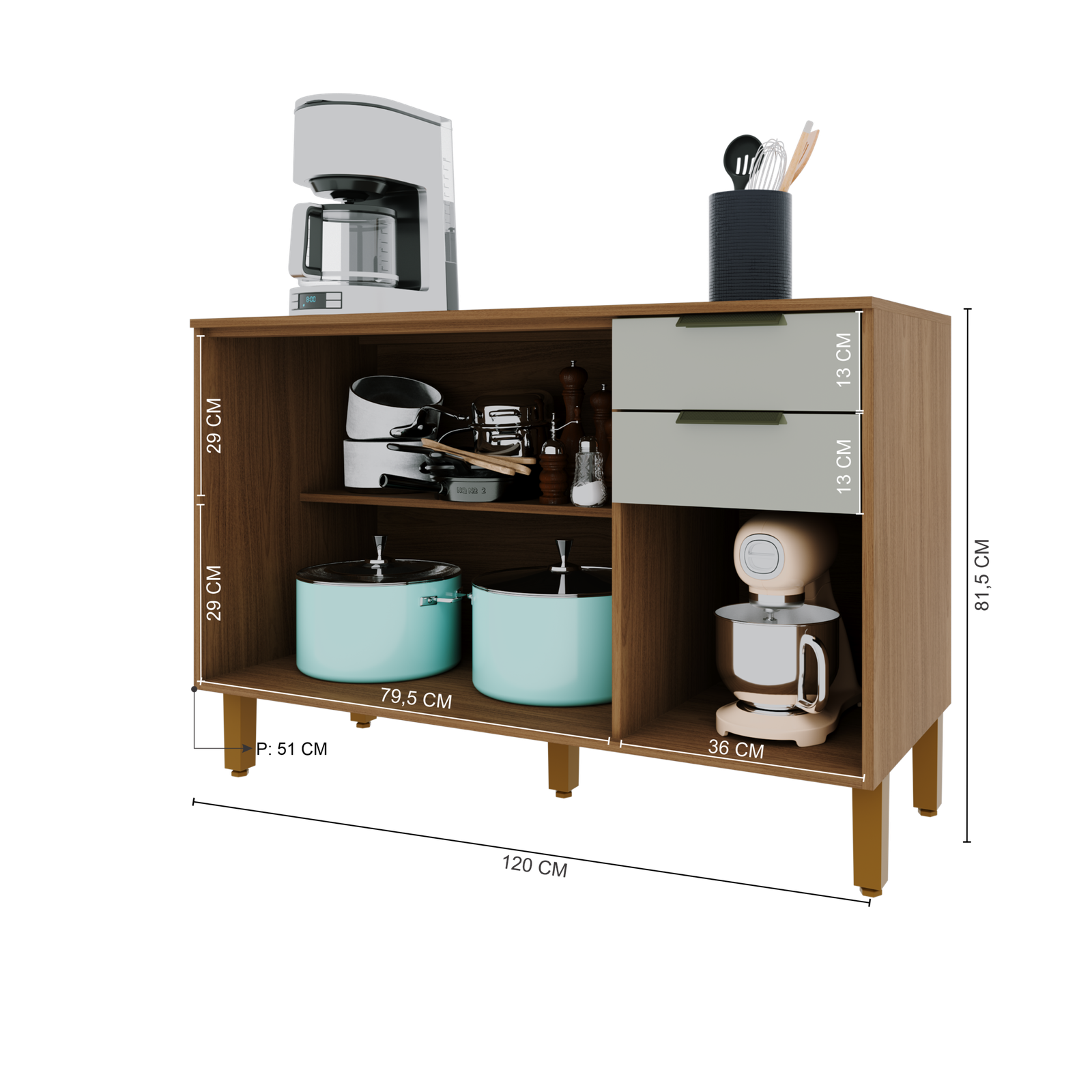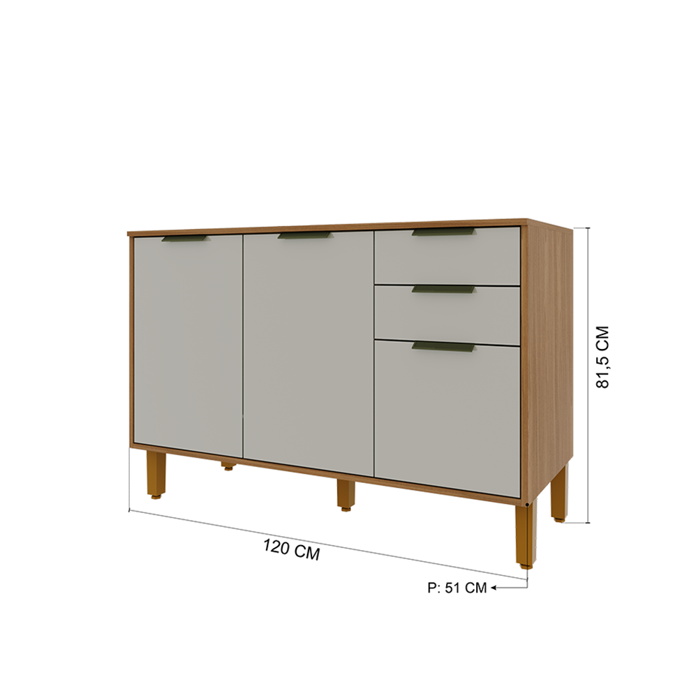 Balcão de 120 cm 3 Portas 2 Gavetas Com tampo Dimensões: – Largura: 120 cm – Altura: 81.5 cm – Profundidade: 51 cm