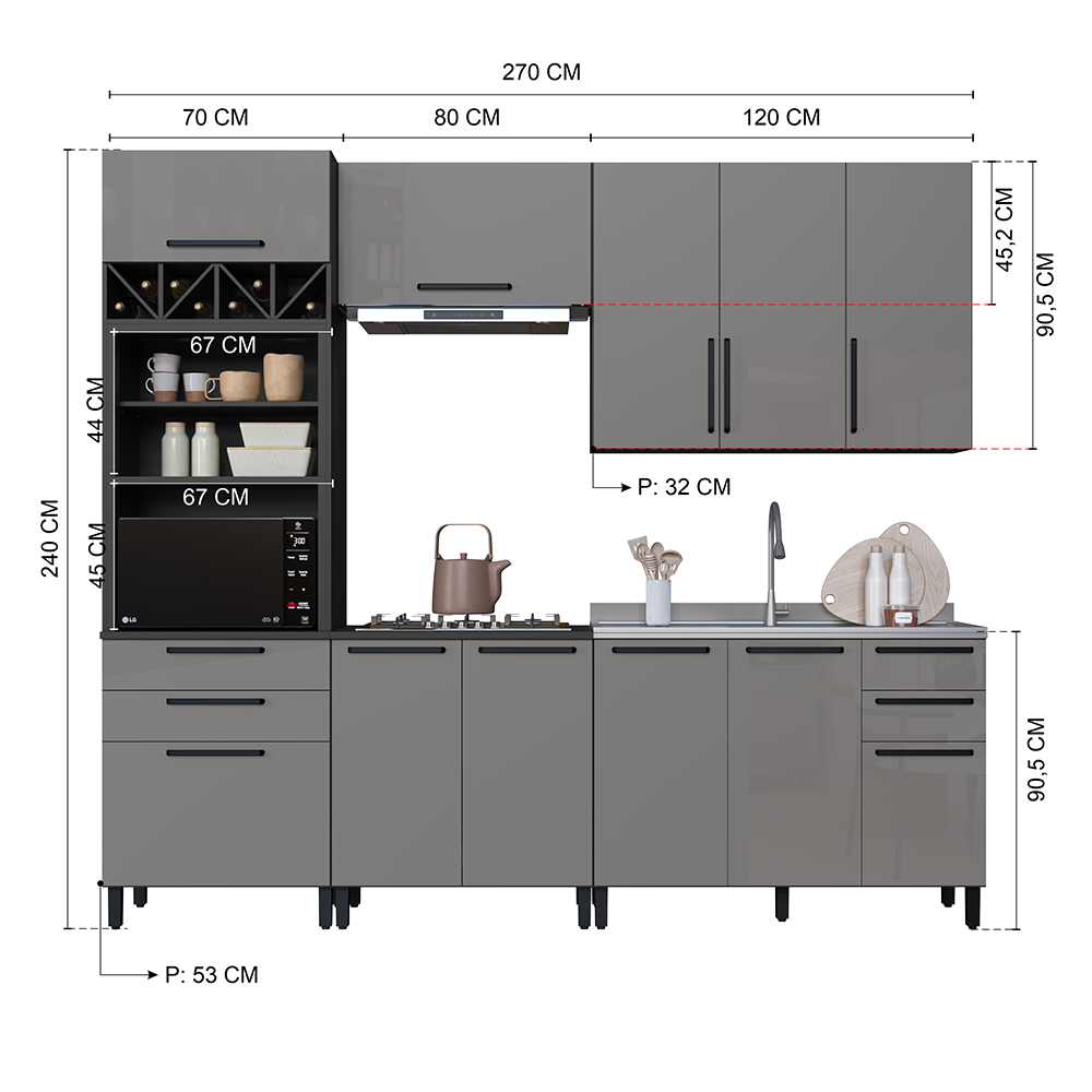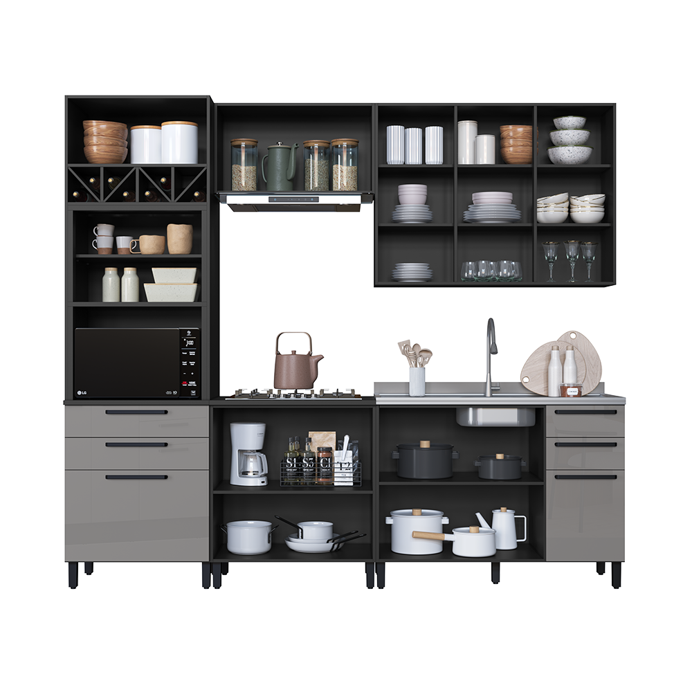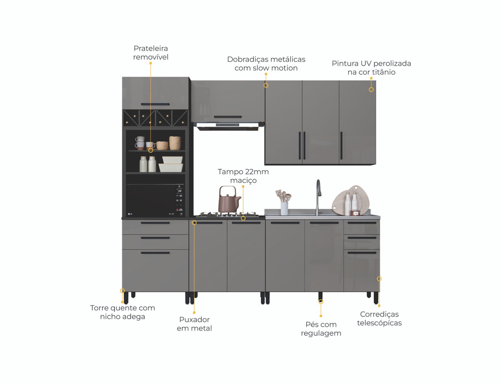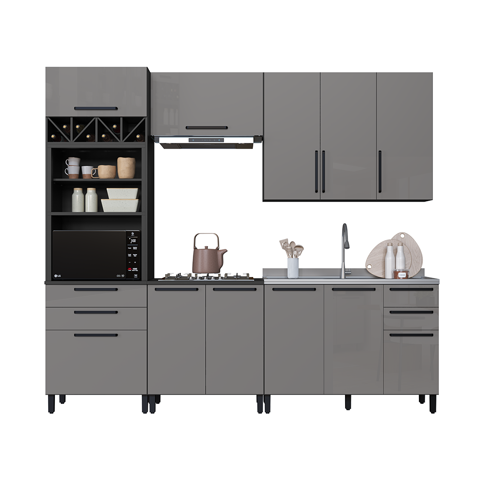 Portas com vidro fumê que valorizam o ambiente, Puxadores em metal sofisticação e durabilidade, Pintura UV perolizada dando aquele toque espelhado na cor Titânio, Cor Touch chumbo fosca, Tampo maciço de 22 mm robustez e elegância, Kit forno com prateleira removível e nicho adega funcionalidade aliada com a criatividade, com Duas alturas disponíveis sendo 226 cm ou 240 cm. Corrediças telescópicas com 3 ciclos maior resistência e durabilidade, Dobradiças metálicas com amortecedores proporcionando um fechamento suave, Pés com regulagem de altura se nivelando melhor no seu ambiente e com opção de rodapé.