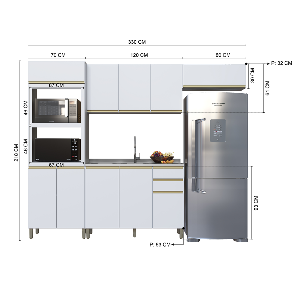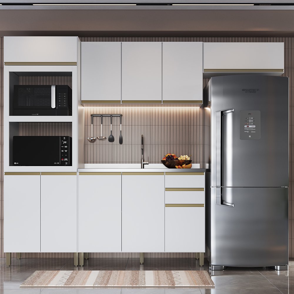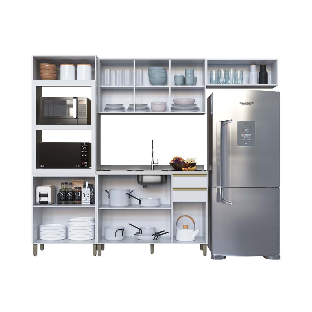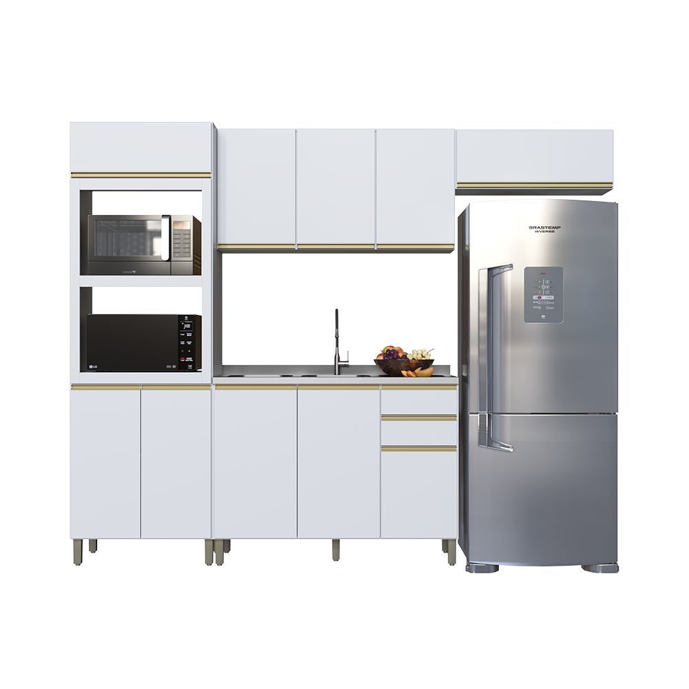 Portas em MDP com opção de vidros off – white na cor Castani. Puxadores em metal une beleza e durabilidade. Pintura UV fosca touch dando um toque natural na cor Castani, pintura uv brilho na cor Branca. Tampo encabeçado 30 mm robustez e elegância. Corrediças telescópicas metálicas maior resistência. Dobradiças metálicas Pés com regulagem de altura se nivelando melhor no seu ambiente.