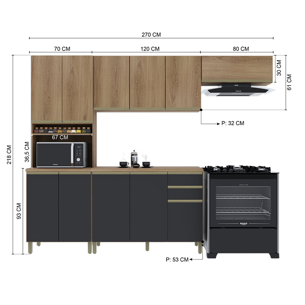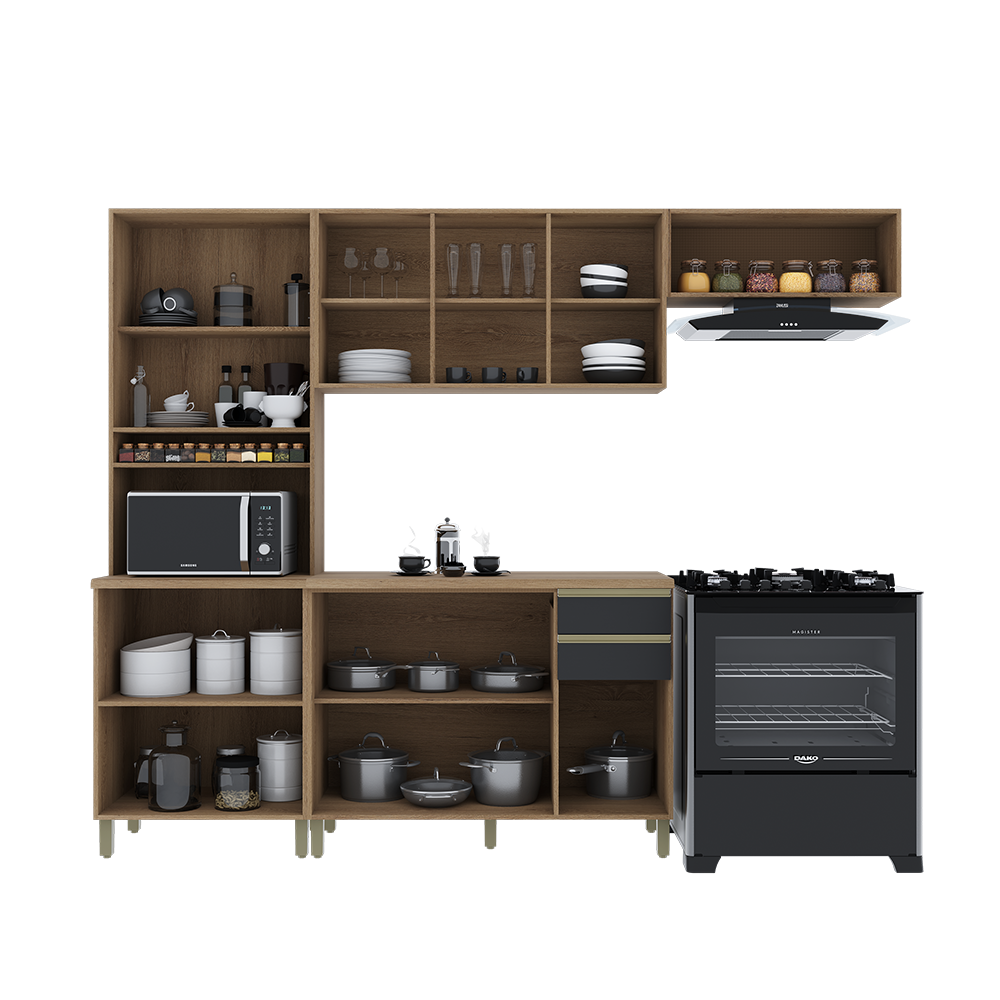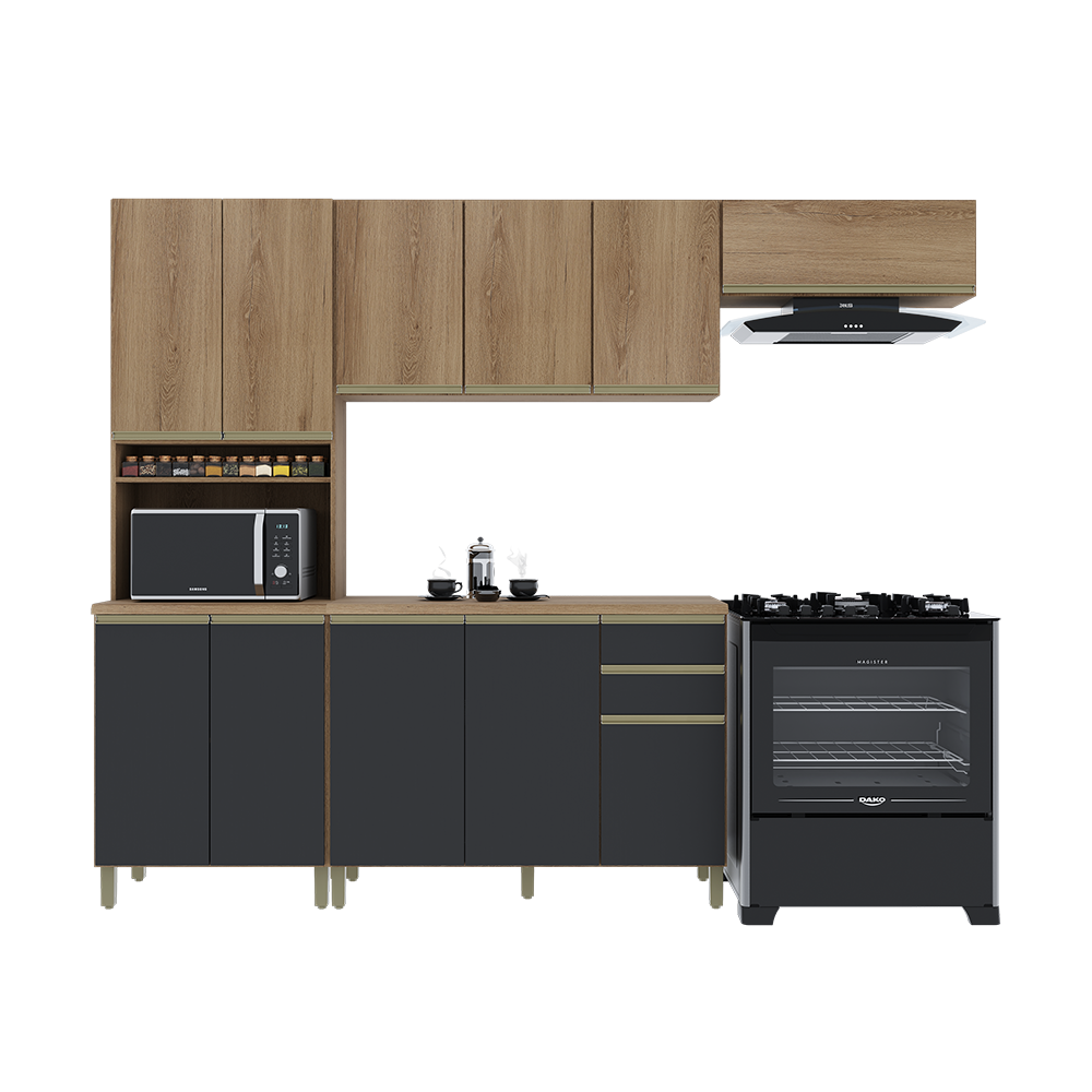 Cozinha completa 100% em MDF. Conta com armários superiores e inferiores espaçosos, adega para vinhos e nichos organizadores. Os puxadores metálicos e as ferragens de alta qualidade garantem abertura suave e resistência no uso diário. Design moderno, funcional e elegante para deixar sua casa ainda mais bonita.