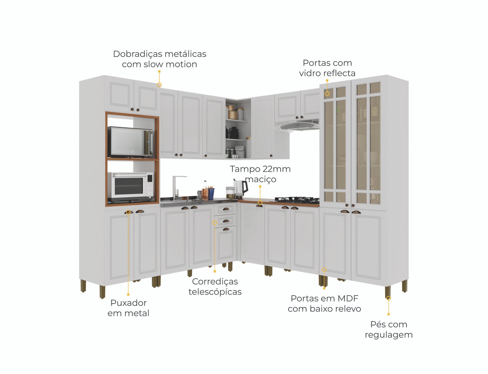 Portas em MDF com acabamento em baixo relevo, beleza e sofisticação, Puxadores em metal une beleza e durabilidade, Pintura UV fosca amadeirada dando um toque natural na cor Freijo, Cor Touch chumbo fosca e na cor UV brilho branca. Tampo maciço de 22 mm robustez e elegância. Corrediças telescópicas largas com 3 ciclos maior resistência e durabilidade, Dobradiças metálicas com amortecedores proporcionando um fechamento suave, Pés com regulagem de altura se nivelando melhor no seu ambiente.