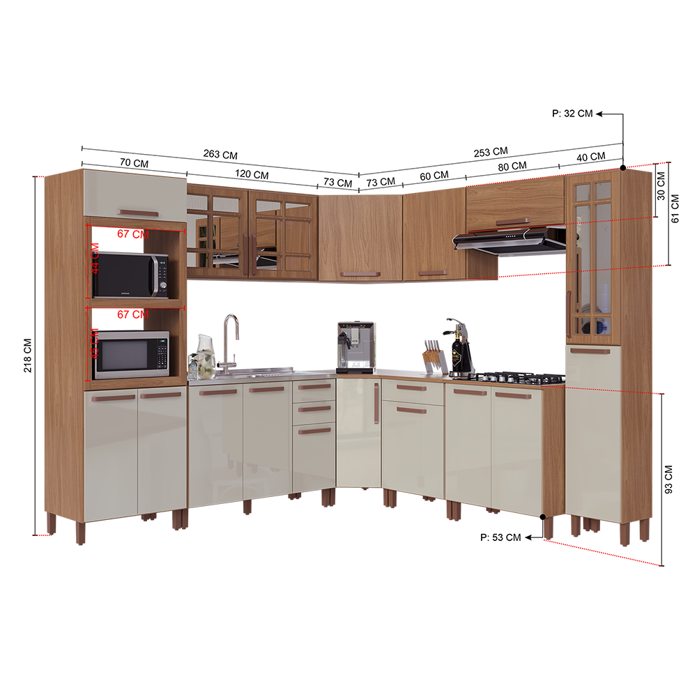 Cozinha produzida em MDP, contando com armários superiores e inferiores bem distribuídos, oferecendo praticidade e ótimo aproveitamento de espaço no dia a dia.