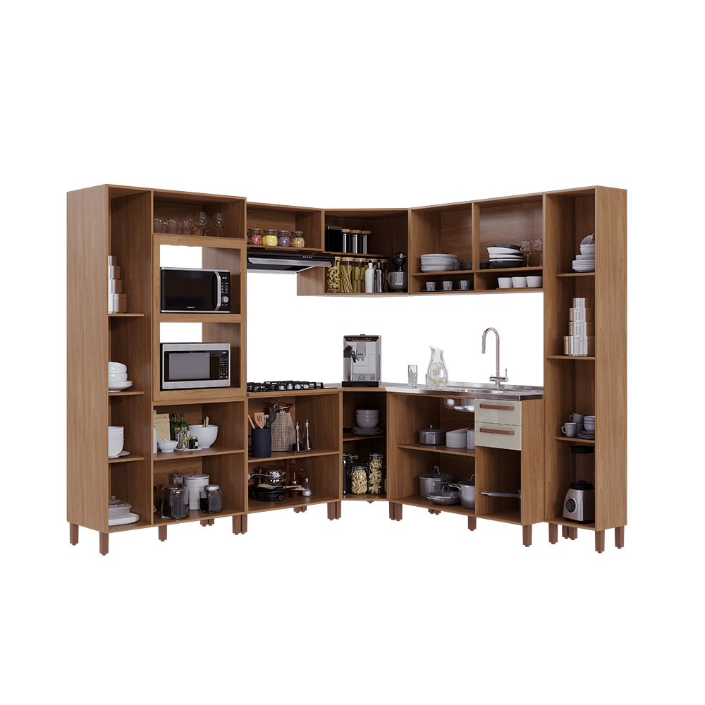 Tampo robusto de 22 mm, oferecendo resistência e estabilidade. Módulos funcionais que facilitam a organização da cozinha, aliando praticidade e eficiência.